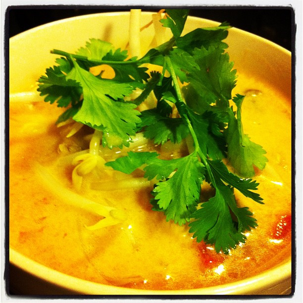 Pour soup into bowls and garnish with cilantro, parsley or basil leaves and serve with additional Sambal Oelek for those who prefer a hotter soup.