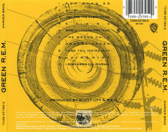 Great news today that took me on a nostalgia trip… R.E.M.’s Warner Bros. debut Green will be getting a reissue.  The 1988 record will be a deluxed CD that includes some art and live recordings. There will also be a vinyl package that recreates the original 1988 art.
